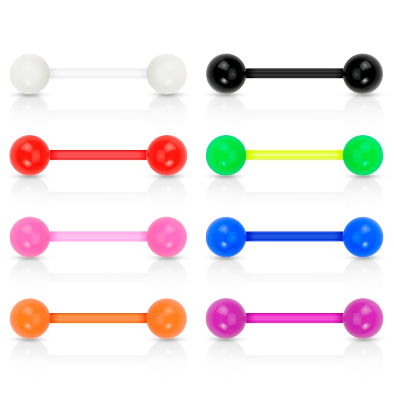 Ce pack contient 8 bijoux pour le piercing à la langue, de couleurs différentes et tous en PTFE / bioplastique. Le PTFE est un matériau plastique très souple et flexible, présentant de nombreux avantages. Il est très confortable à utiliser, notamment grâce à sa souplesse, et tu le sentiras donc à peine dans ta langue. Si tu reçois un coup sur la langue, le bijou se pliera également. En fait, notre langue est un muscle que nous utilisons non-stop tout au long de la journée. Porter une barre de ce matériau peut donc être une très bonne idée.