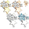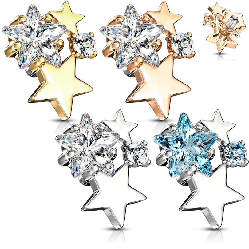 Avec ce bijou, tu n'auras pas une étoile mais trois étoiles ! Tu as deux étoiles brillantes, une étoile en pierre et une petite pierre claire sur le côté. Il se passe beaucoup de choses sur ce bijou. L'étoile est en laiton et le dos de la vis est en acier chirurgical. La partie en laiton a été revêtue de différentes couleurs que tu peux choisir.