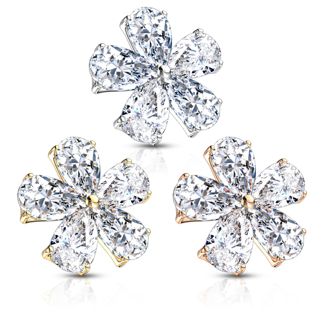 Le motif de fleur est très populaire comme design pour les piercings. C'est un look simple mais beau. Sur cette dermal anchor en forme de fleur, il y a 5 pierres en forme de gouttes d'eau qui forment les feuilles. La fleur est en laiton et enduite d'une belle couleur. Au dos, il y a une vis en acier chirurgical.