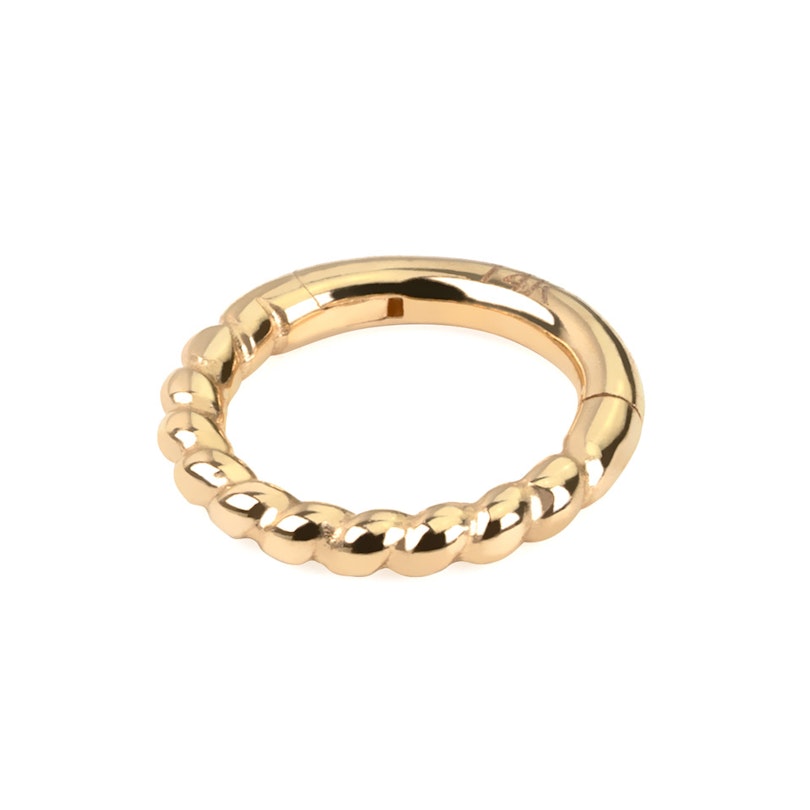 Ce modèle ressemble, une fois fermé, à un anneau sans fin. Il possède toutefois une charnière qui s'ouvre facilement. Tu peux ainsi facilement l'insérer dans ton piercing et le fermer en un seul clic. L'anneau est en or 14 carats et est disponible en deux couleurs différentes : or jaune ou or blanc. Il est également disponible en plusieurs diamètres de sorte que tu puisses choisir ce qui convient le mieux à ton piercing.