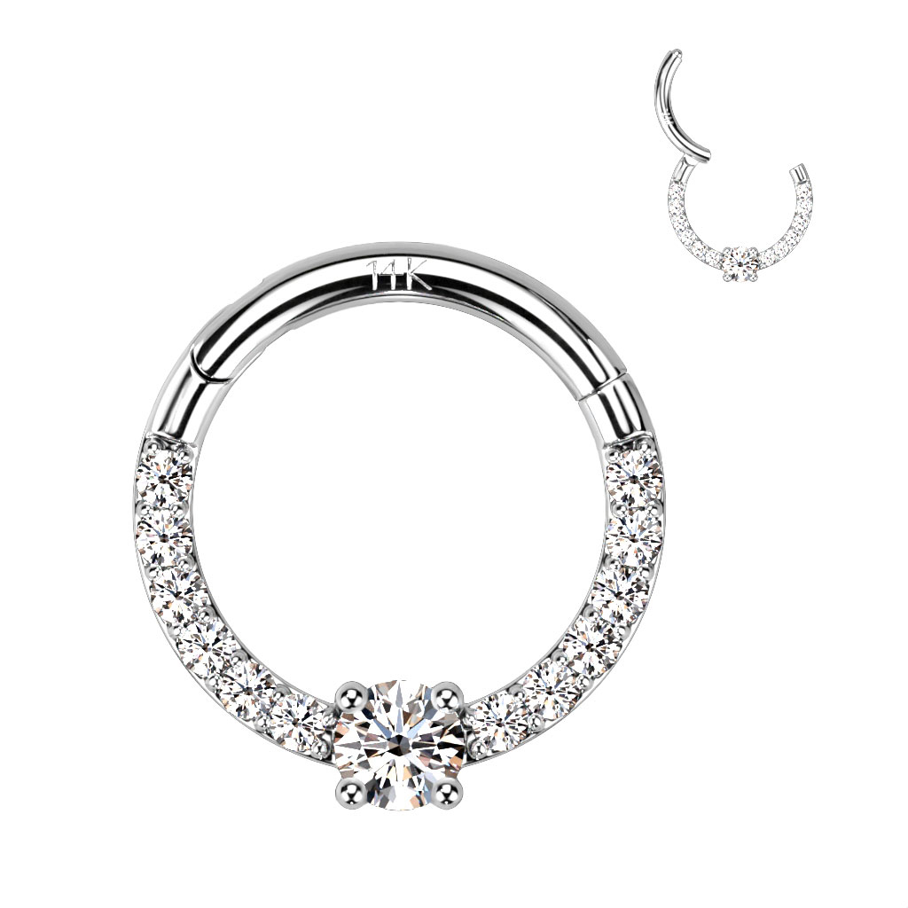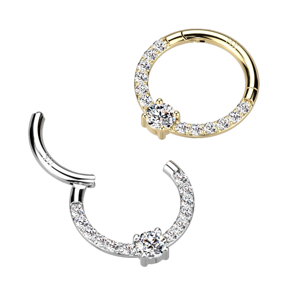 Ce joli anneau en or 14 carats brille de mille feux, notamment grâce à la pierre sertie en son centre et ses extrémités ornées de pierres. Des pierres transparentes en zircone ornent la partie avant de ce bijou, il ne passera donc pas inaperçu dans tes trous de piercing au septum et à l'oreille, comme à l'hélix ou au daith. Il est disponible en deux couleurs différentes (or blanc et or jaune). Tu peux également choisir entre deux diamètres différents (8 mm et 10 mm).
