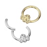 Cet anneau à charnière possède un élégant design en forme d'abeille sur la partie avant, ce qui confère à ce design autrement simple un look qui sort de l'ordinaire. Tu peux choisir la couleur que tu préfères parmi deux options différentes (or et argent) et le diamètre entre deux options différentes (8 mm et 10 mm). Les dimensions du design en forme d'abeille sont les suivantes : 6 mm (largeur), 5,1 (hauteur) et 1,2 mm (épaisseur). Les anneaux à charnière sont des bijoux de piercing très pratiques pour les trous de piercing au septum et à l'oreille, notamment pour les trous de piercing au tragus, à l'anti-tragus et au rook où l'espace est limité. Cet anneau ne possède aucune pièce détachable et le mécanisme de fermeture est très facile à utiliser. Il te suffit de tirer délicatement le segment à charnière pour l'ouvrir, d'insérer le bijou dans ton trou de piercing et de remettre le segment en place pour le fermer.