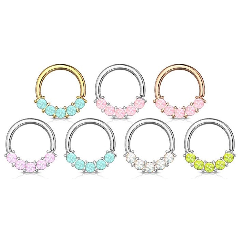 Les bijoux sont en acier chirurgical et recouverts de différentes couleurs, par exemple, un or rose féminin. Tu peux voir la sélection complète un peu plus haut sur la page. L'anneau est fait pour être tordu d'avant en arrière, il est donc incroyablement facile à utiliser.