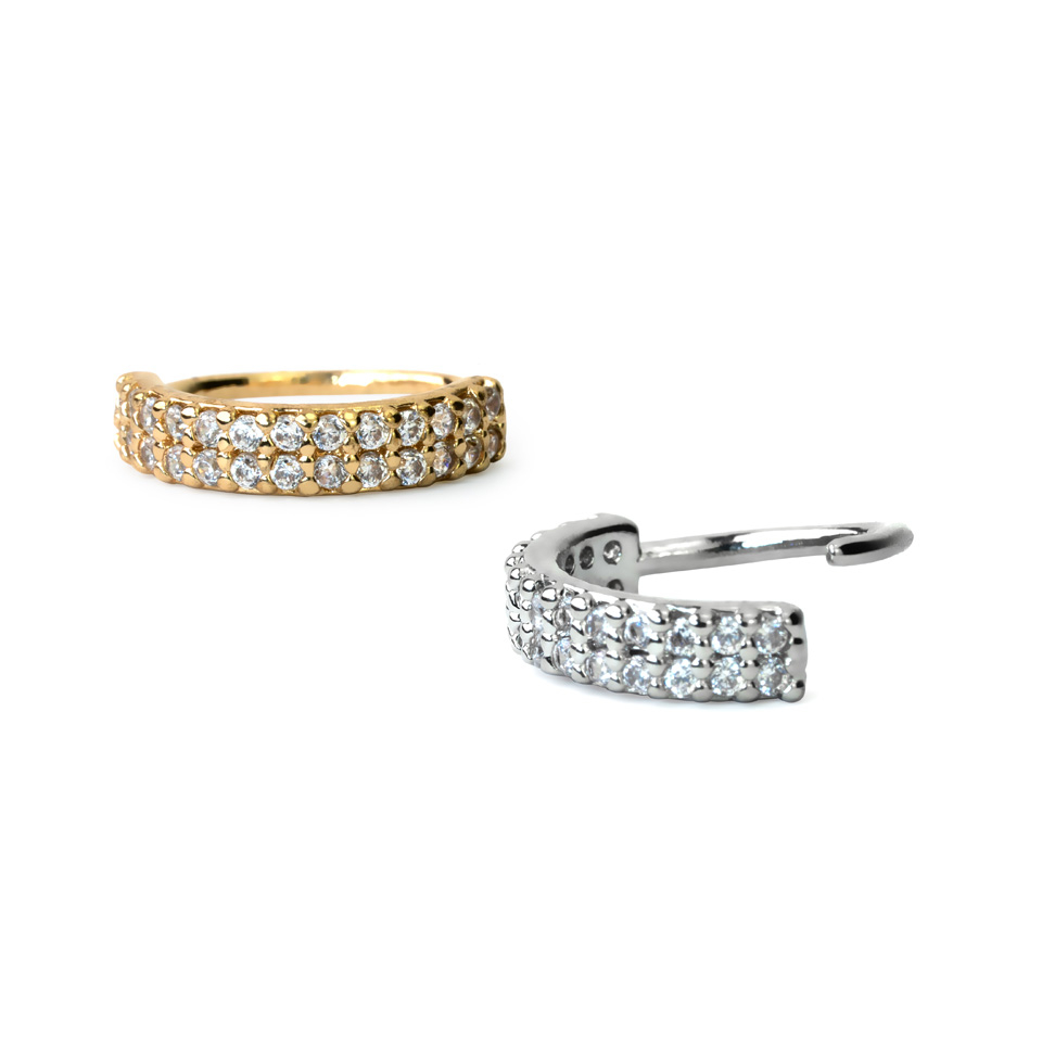 Il n'y a pas moins de 2 rangées de pierres sur l'anneau, couvrant presque la moitié de l'anneau - 26 petites pierres claires étincelantes au total. L'autre moitié de l'anneau doit reposer dans ton piercing.