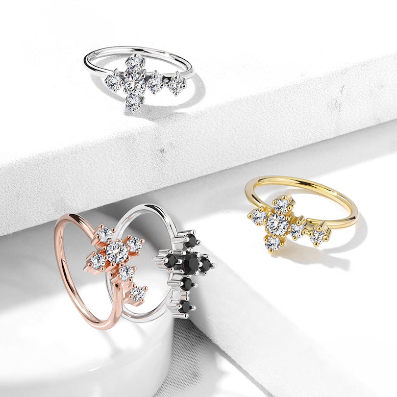 Le bijou est en laiton et mesure 0,8 mm. en épaisseur de fil et 8 mm. de diamètre. Il a été plaqué en platinium pour la version blanche ou en or 14 carats pour les deux modèles en or. Comme tu l'as remarqué, il y a aussi une jolie croix sur le devant des bijoux. Cette croix est incrustée de six petites pierres - pour lesquelles tu peux choisir la couleur. Par exemple, l’anneau existe avec des pierres claires ou des pierres noires sur la croix.