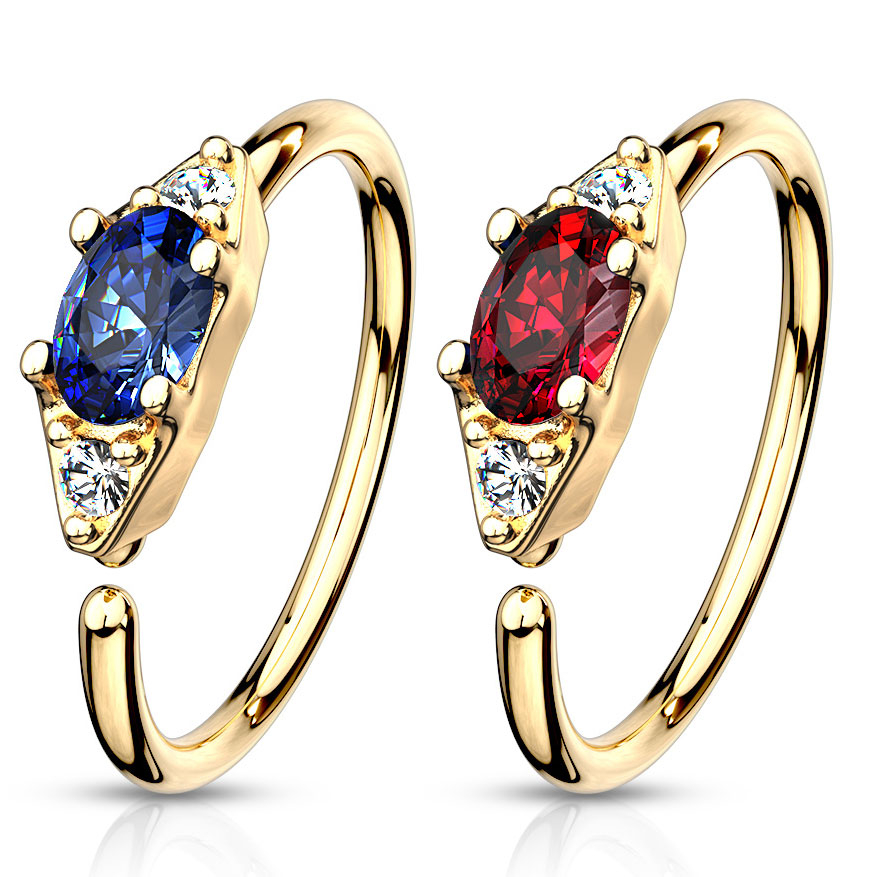 À l'avant se trouve une petite plaque ovale en laiton. Cette plaque a également été recouverte d'or 14 carats, de sorte qu'elle s'harmonise avec le reste de l'anneau sur lequel elle repose. Sur le dessus de la plaque, il y a trois pierres, dont deux petites et rondes. Au milieu des deux pierres, il y a une pierre ovale plus grande qui est colorée. Tu peux choisir ci-dessus la couleur de la pierre, alors, jette un œil aux options disponibles.