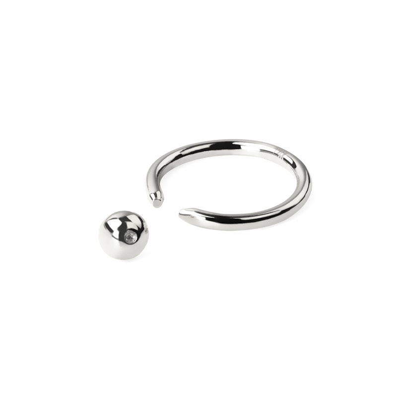 Ce modèle est disponible en deux épaisseurs de fil différentes : 1 mm et 1,2 mm, tous deux avec une boule de 3 mm. Les anneaux avec une épaisseur de fil de 1,6 mm et un diamètre plus grand sont disponibles avec une boule de 4 mm de diamètre.