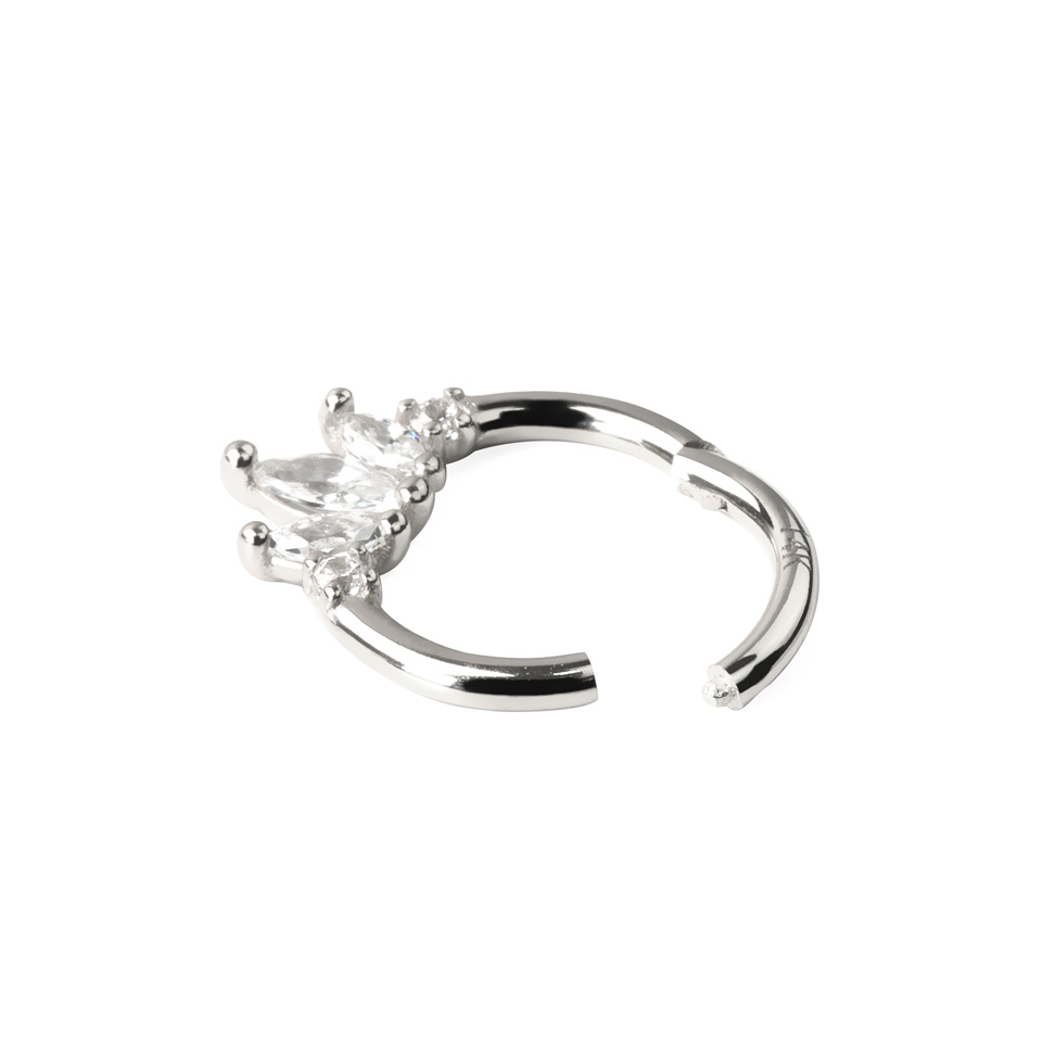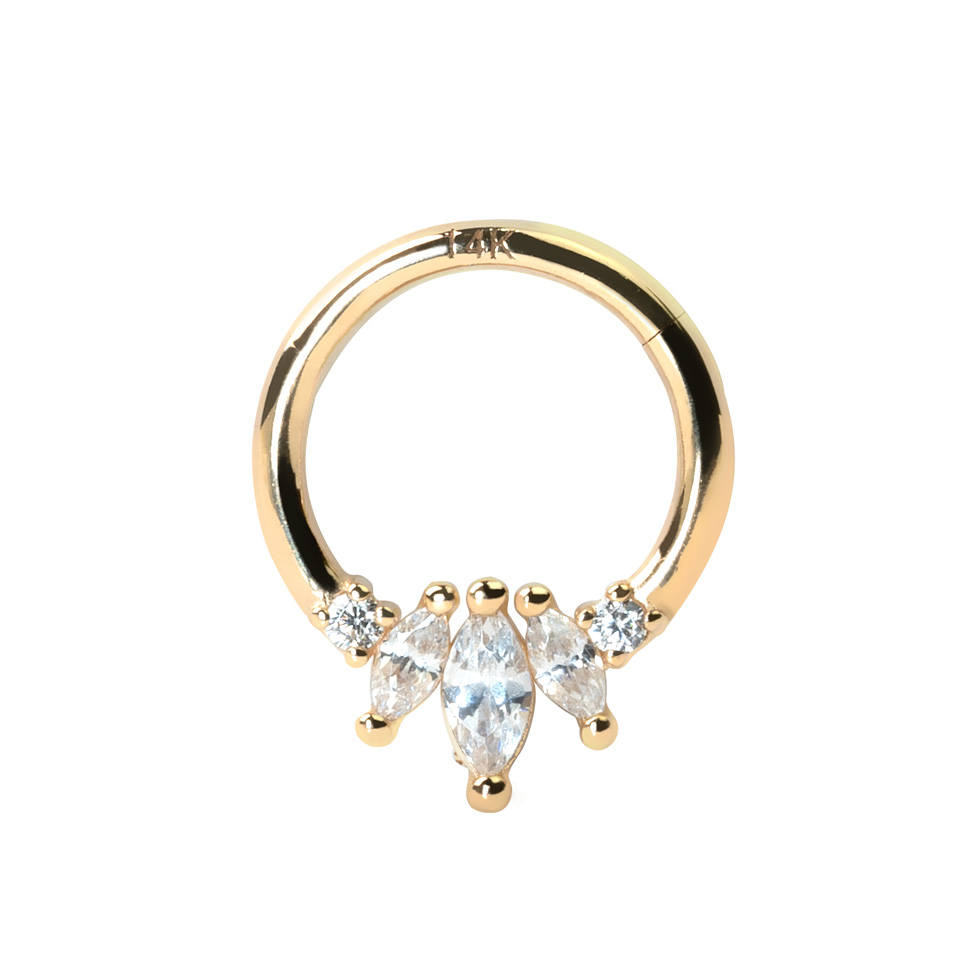 L'anneau a cinq pierres montées dans le bas. De chaque côté se trouvent deux petites pierres rondes. À côté d'eux se trouvent deux petites pierres ovales et au centre une plus grande pierre ovale. Ensemble, cela donne une belle cascade de pierres qui décoreront tout piercing.