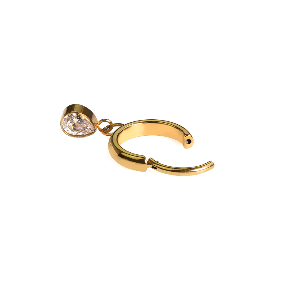 Le bijou que nous te présentons est une créole au design saisissant. Comme tu peux le voir, elle possède une pierre pendante et sertie de 4,5 mm, en forme de goutte et en oxyde de zirconium, attachée à l'aide de deux petits anneaux.