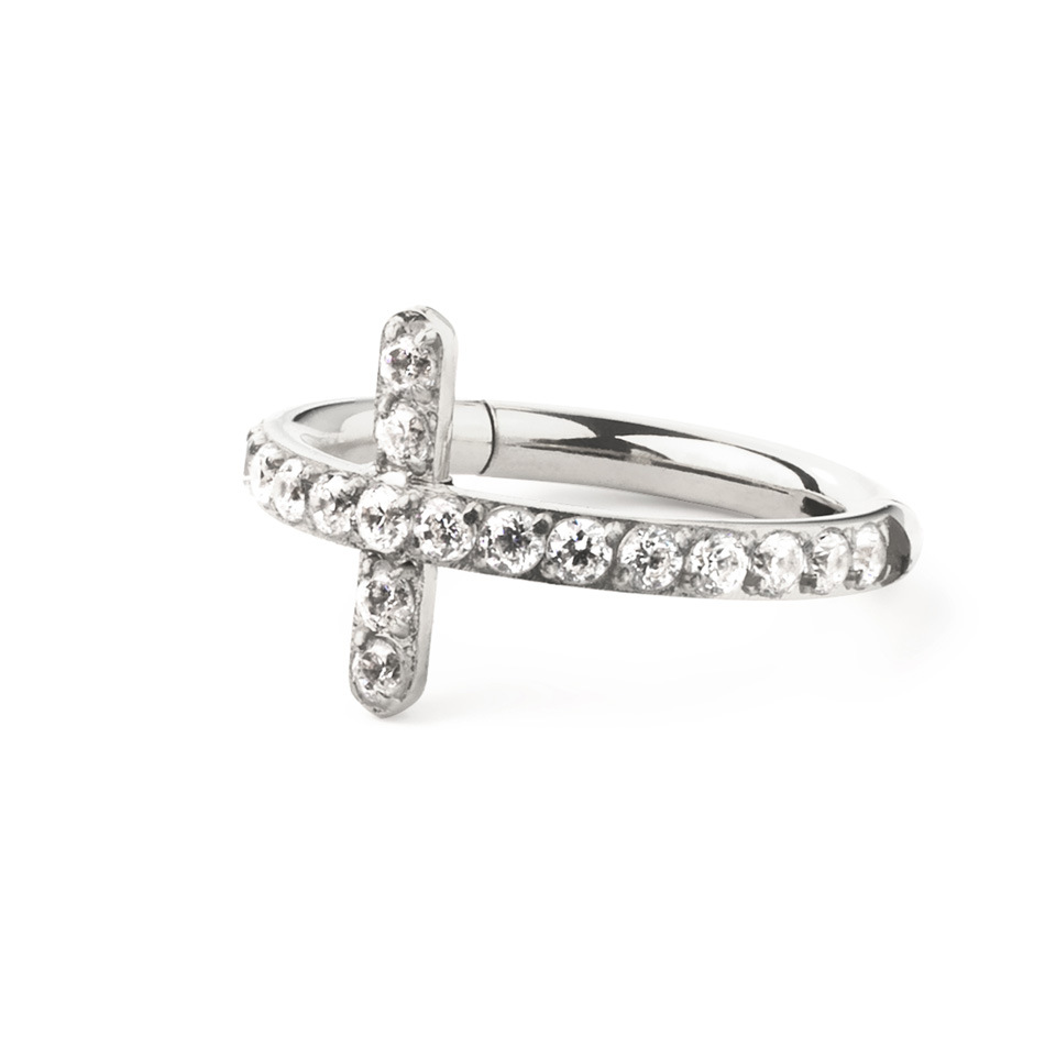 La partie avant de l'anneau que nous te présentons forme une croix ornée de petites pierres. Grâce à son mécanisme de fermeture à charnière, ce bijou est très facile à insérer et à enlever de ton trou de piercing. De plus, il est en titane, un matériau hypoallergénique et très durable. Tu n'as donc aucun souci à te faire : ton bijou conservera tout son éclat et toute sa splendeur !