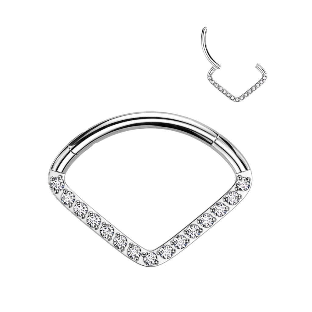 Tu recherches un bijou qui brille de mille feux ? Nous avons exactement ce qu'il te faut ! Ce sublime anneau présente un design intemporel en forme de chevron. De plus, sa partie angulaire est ornée de pierres transparentes en oxyde de zirconium et sa partie incurvée (celle qui s'insère dans ton trou de piercing) offre un confort optimal. En résumé, c'est l'anneau idéal si tu aimes les bijoux étincelants qui attirent tous les regards.