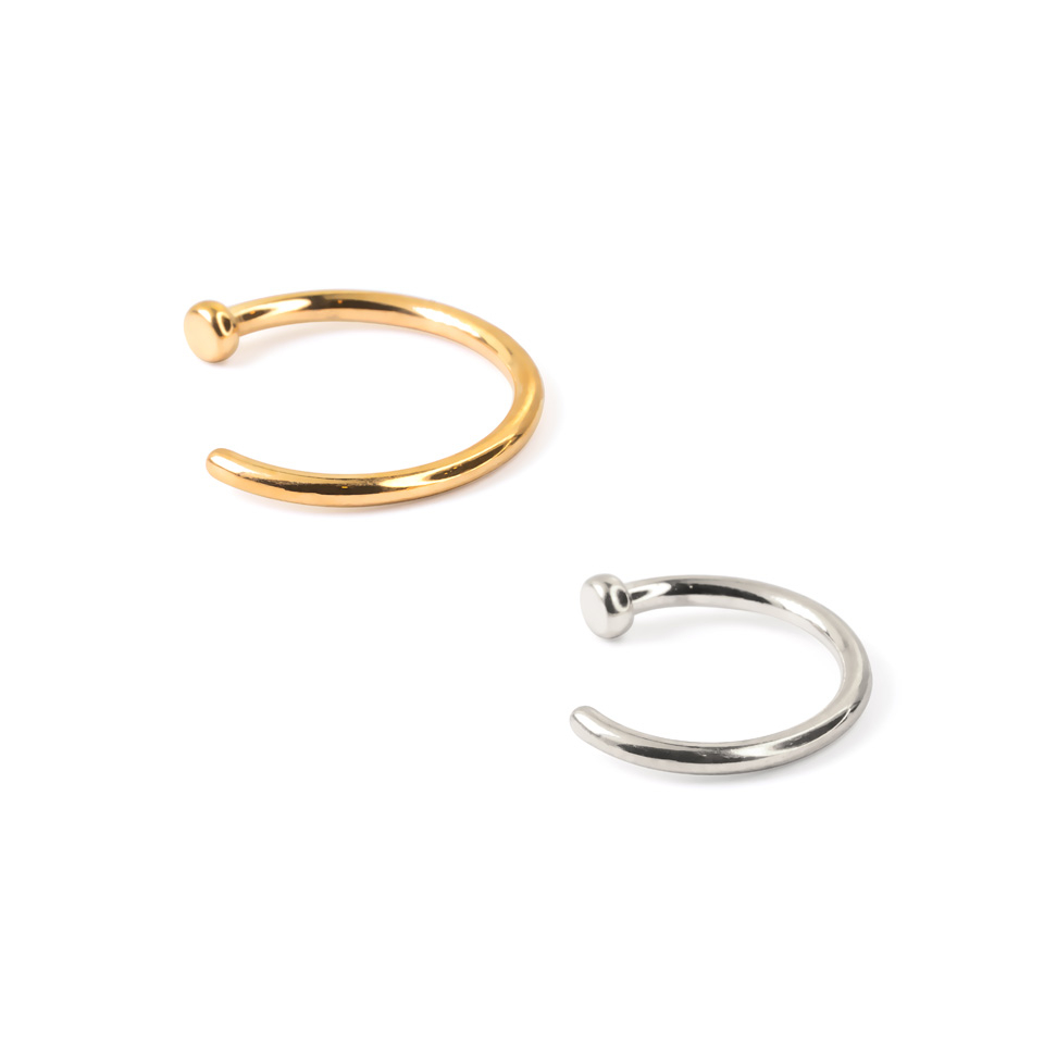 À l'une des extrémités de l'anneau se trouve un petit élément circulaire qui empêchera le bijou de tomber de ton nez. L'autre extrémité de l'anneau est polie et arrondie de sorte à éviter d'endommager ta peau au moment où tu inséreras ce bijou dans ton trou de piercing. Tu peux choisir l'épaisseur du fil, la couleur ainsi que le diamètre de l'anneau qui te convient pour qu'il rentre parfaitement dans ton piercing.