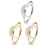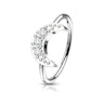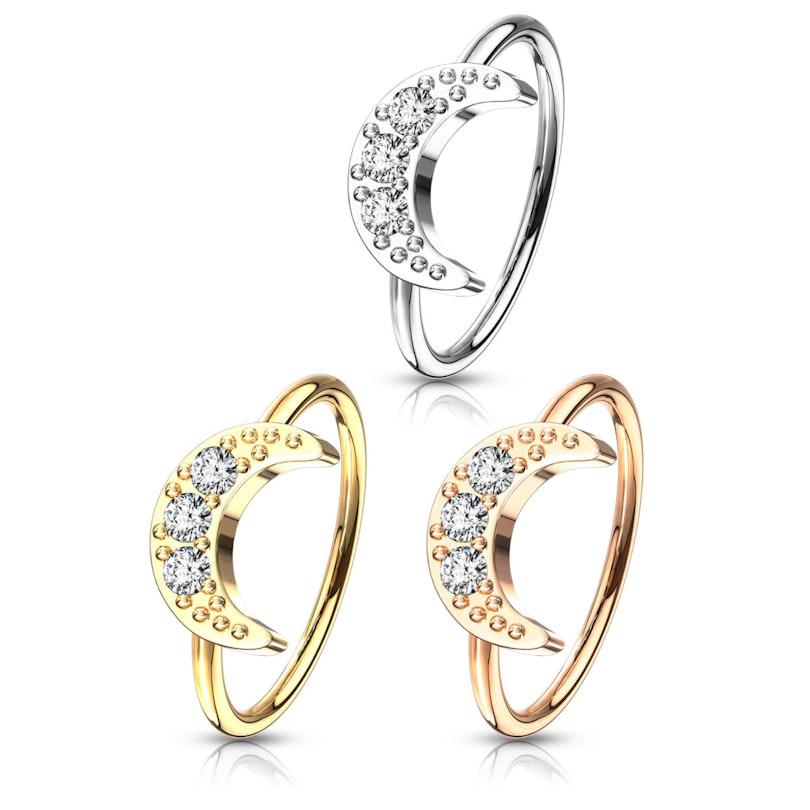 Le bijou que nous te présentons est un anneau sans fin avec un design en forme de croissant de lune. Comme tu peux le voir, ce design est orné de trois pierres scintillantes en son centre et de jolis petits studs.