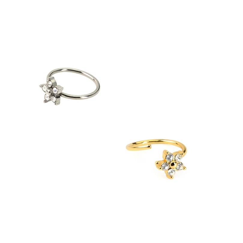 Le bijou que nous te présentons est un joli anneau avec une fleur au design aussi sophistiqué que saisissant. Comme tu peux le voir, chaque pétale de la fleur est orné de cinq pierres et une perle se trouve en son centre. Ce joli bijou est disponible en deux finitions différentes (or et argent). De plus, il est en acier chirurgical, un matériau résistant, durable et qui ne perd pas de son éclat au fil du temps. Avec une épaisseur du fil de 0,8 mm, il s'agit d'un bijou idéal pour les piercings au nez, mais il sera également du plus bel effet dans ton hélix ou de nombreux autres piercings d'oreilles. Enfin, il est très facile à mettre en place : il te suffit de le tordre délicatement pour l'ouvrir, de l'insérer dans ton trou de piercing et le tour est joué !