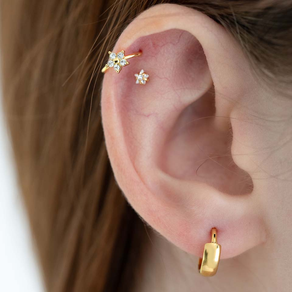 Le bijou que nous te présentons est un joli anneau avec une fleur au design aussi sophistiqué que saisissant. Comme tu peux le voir, chaque pétale de la fleur est orné de cinq pierres et une perle se trouve en son centre. Ce joli bijou est disponible en deux finitions différentes (or et argent). De plus, il est en acier chirurgical, un matériau résistant, durable et qui ne perd pas de son éclat au fil du temps. Avec une épaisseur du fil de 0,8 mm, il s'agit d'un bijou idéal pour les piercings au nez, mais il sera également du plus bel effet dans ton hélix ou de nombreux autres piercings d'oreilles. Enfin, il est très facile à mettre en place : il te suffit de le tordre délicatement pour l'ouvrir, de l'insérer dans ton trou de piercing et le tour est joué !