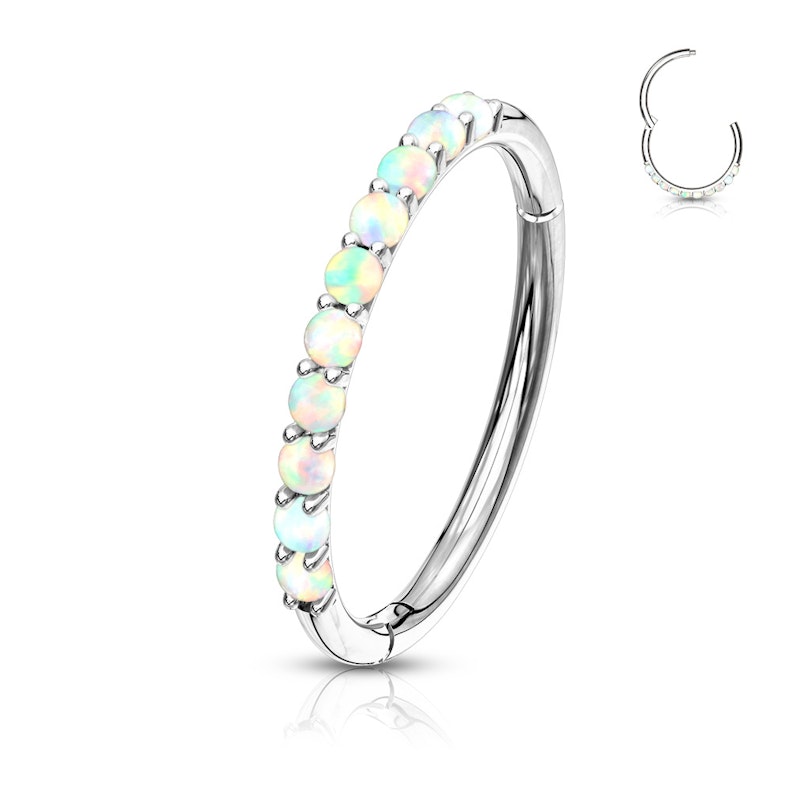 L'anneau fonctionne bien dans les piercings à l'oreille et les piercings au nez. Peut-être pas dans le septum, car les opales seront alors dirigées vers le bas. Les opales ne sont pas de véritables opales car elles sont trop fragiles pour l’utilisation de bijoux. Ce sont des opales synthétiques qui ont été utilisées car elles sont beaucoup plus résistantes - Seul un expert serait capable de voir la différence.
