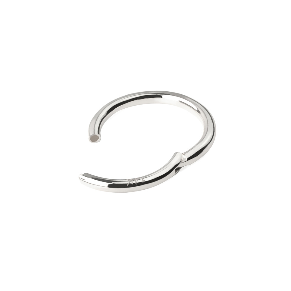 L'anneau que tu vois sur la photo ci-dessus contient une petite charnière. Ne crains donc pas de perdre des pièces lorsque tu portes ou retires ce bijou. Tu peux ouvrir et fermer cet anneau d'un simple clic.
