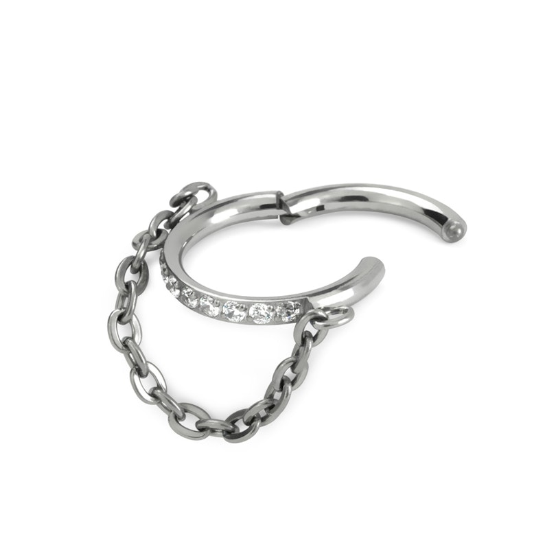 Comme tu peux le voir sur l'image de présentation, ce joli bijou est un anneau segment en titane orné d'une rangée de pierres et muni d'une chaîne attachée au milieu de chaque extrémité de l'anneau. Ce détail fait toute la différence, car de cette façon, la chaîne vient se positionner quelques centimètres sous l'anneau, ce qui crée un effet saisissant.