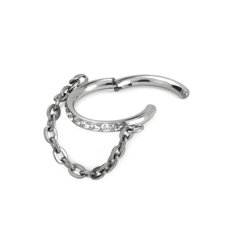 Comme tu peux le voir sur l'image de présentation, ce joli bijou est un anneau segment en titane orné d'une rangée de pierres et muni d'une chaîne attachée au milieu de chaque extrémité de l'anneau. Ce détail fait toute la différence, car de cette façon, la chaîne vient se positionner quelques centimètres sous l'anneau, ce qui crée un effet saisissant.