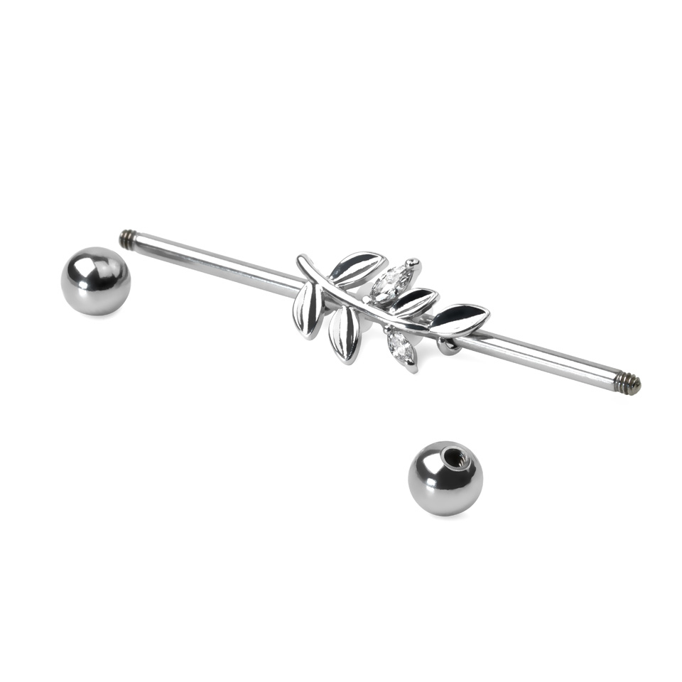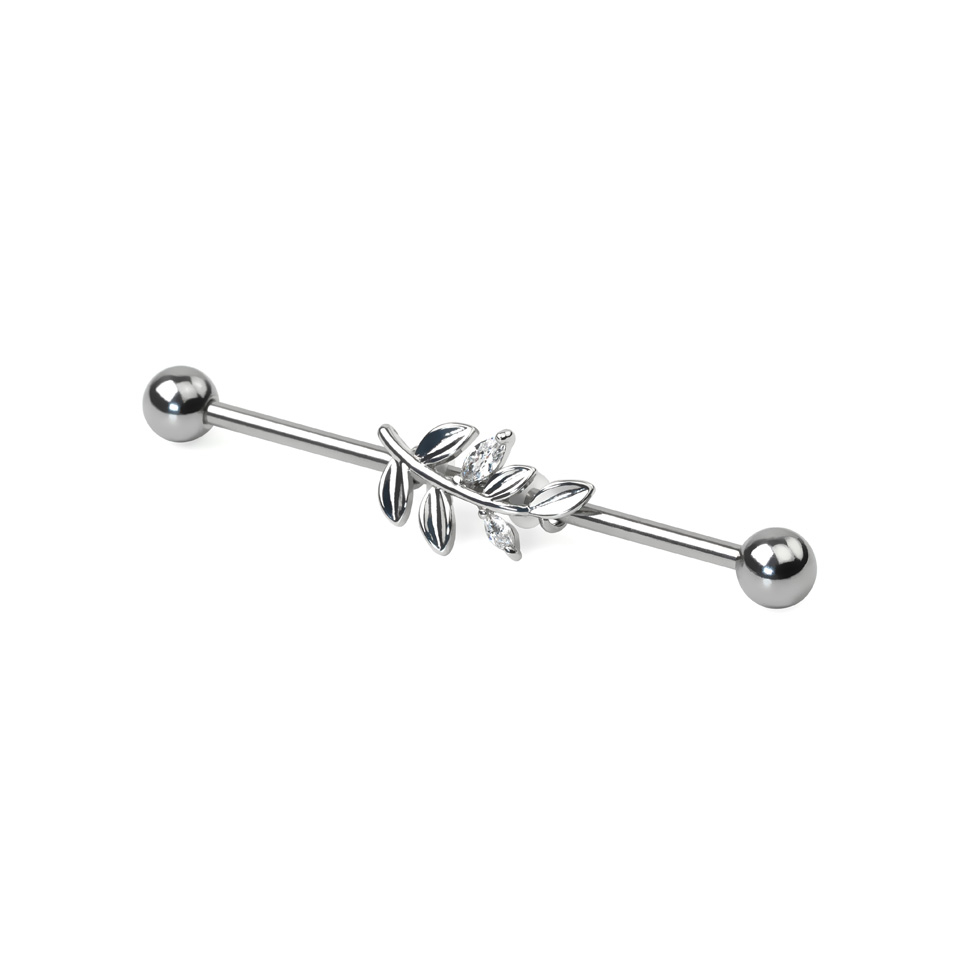 Les fleurs et les feuilles font toujours bon ménage avec les bijoux. Cette tige industrielle ne fait pas d'exception. Au milieu de la tige se trouve une barre mobile avec de petites feuilles. Deux des feuilles sont remplacées par une jolie pierre claire, ce qui rend le bijou encore plus beau. La tige peut être fixée où tu le souhaites avec le joint torique fourni.