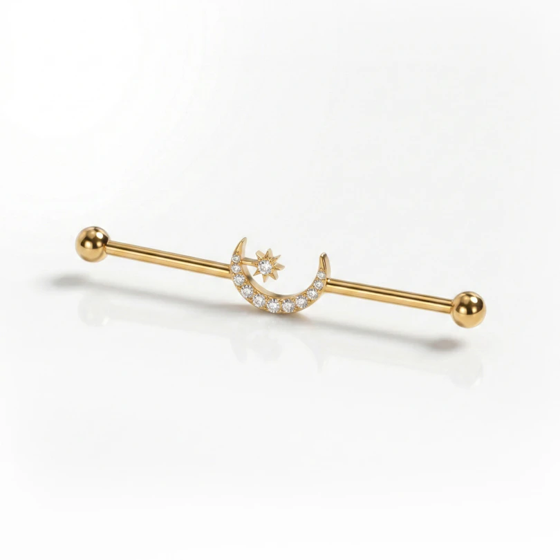 Tu recherches un industriel qui sort de l'ordinaire pour donner un nouvel élan à ton style ? Ne cherche plus ! Comme tu peux le voir, un croissant de lune orné de petites pierres se trouve au beau milieu de ce barbell industriel, ce qui crée un effet aussi saisissant qu'original. Une petite étoile vient ajouter une subtile touche de contraste, avec justesse et légèreté. Deux modèles sont disponibles : un doré et un argenté.