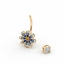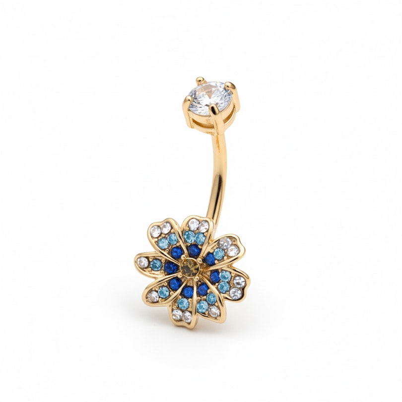 Le bijou que nous te présentons est un barbell pour le nombril idéal pour la saison des crop tops. Comme tu peux le voir, il est orné d'une fleur composée de petites pierres avec plusieurs teintes de bleu et d'une pierre jaune en son centre. Enfin, dernier détail et non des moindres : la boule supérieure affiche une jolie pierre transparente.