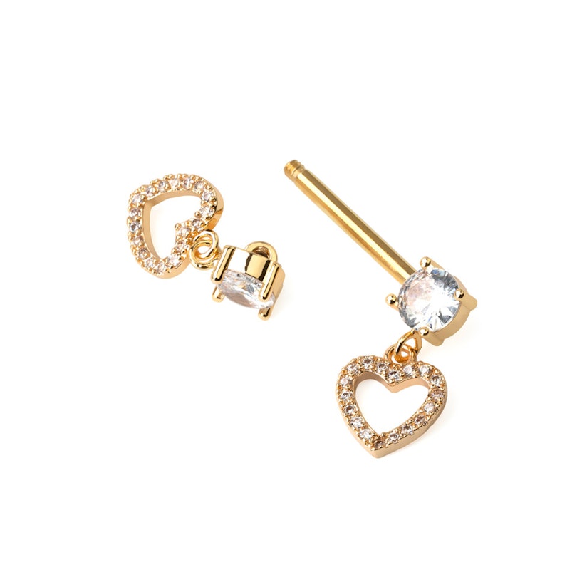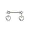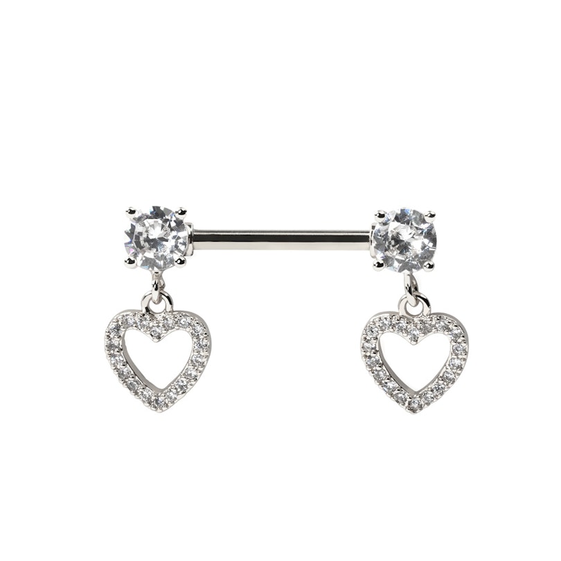 Le superbe bijou que nous te présentons se distingue par l'originalité de son design. Comme tu peux le voir, ce barbell pour le téton affiche une pierre en zircon à chacune de ses extrémités, desquelles pend une jolie breloque en forme de cœur, elle-même ornée de pierres, pour toujours plus de brillance !