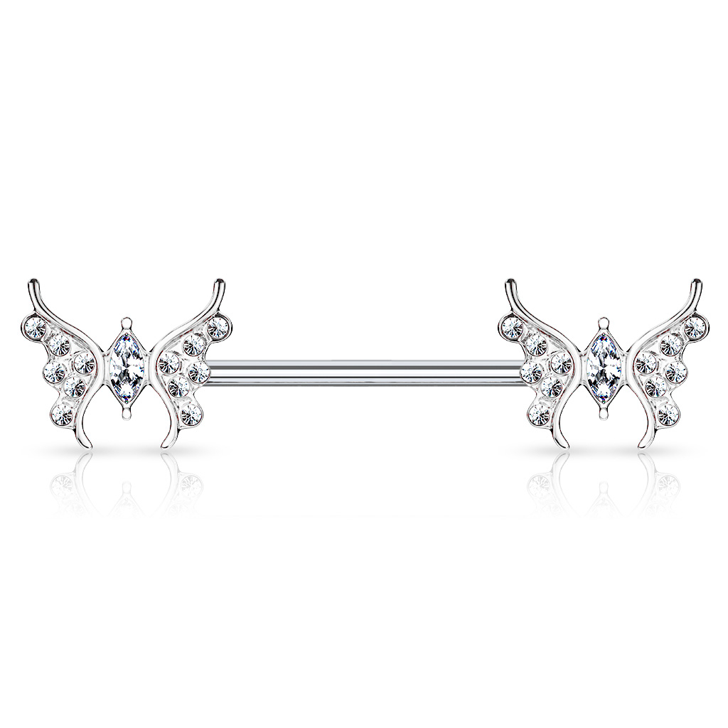 Si tu cherche un modèle spécial pour ton piercing aux tétons, nous avons ce qu'il te faut. Ce bijou est constitué d'une tige droite d'environ 17 mm. À chaque extrémité, il y a un petit papillon avec de jolies ailes. Le corps du papillon est décoré d'une petite pierre de marquise, qui suit très bien les lignes du corps. Les ailes sont décorées de petites pierres de couleur claire combinées à la grande pierre du centre.