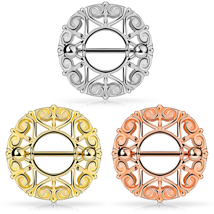 On peut dire que ce bijou est comme une couronne pour le mamelon. C'est un bijou vraiment magnifique et totalement symétrique, avec un design élégant dans lequel différentes formes sont combinées.