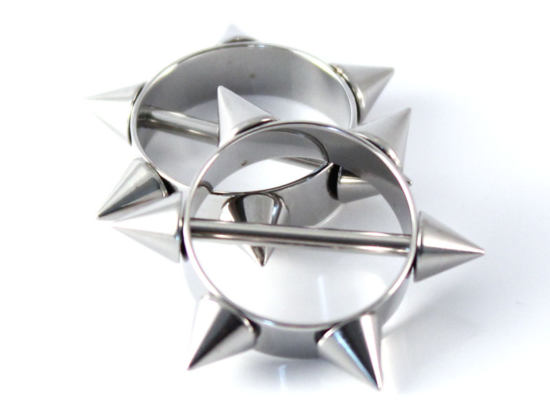 Ce bouclier est en acier chirurgical, ce qui le rend parfait pour la plupart des piercings. Son diamètre inférieur est de 15 mm et les pointes mesurent 5 mm de hauteur. La bague mesure 5 mm de profondeur et est traversée par la tige. Il a la taille standard des bijoux pour le mamelon, il peut donc être adapté à la plupart des piercings.