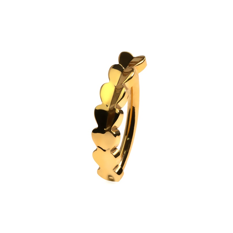 Le bijou que nous te présentons est un superbe clicker pour le nombril en titane de qualité implantaire, un matériau idéal pour les personnes à la peau sensible en raison de ses propriétés hypoallergéniques. Comme tu peux le voir, il possède un design élégant en forme de cœurs sur sa partie avant. Enfin, il est muni d'un mécanisme de fermeture à charnière. Dans la pratique, cela signifie qu'il est très simple à mettre en place.