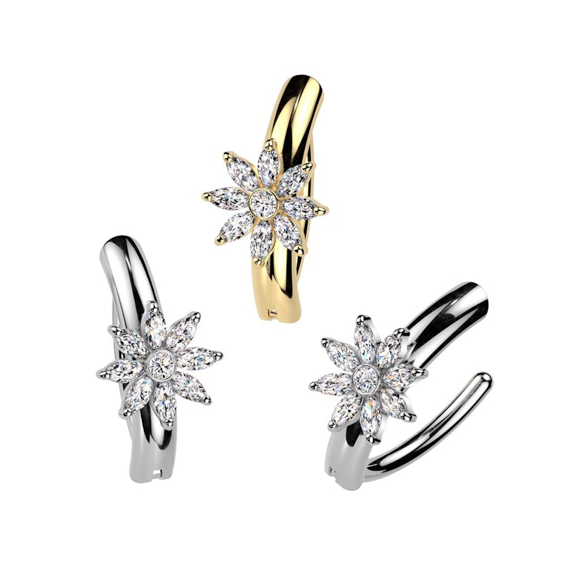 Le bijou que nous te présentons est un joli clicker pour le nombril avec, en son centre, un design en forme de fleur orné de neuf pierres scintillantes en oxyde de zirconium. Il est disponible avec des finitions en or ou en argent.