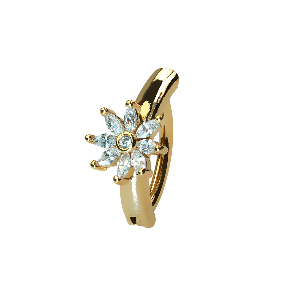 Le bijou que nous te présentons est un joli clicker pour le nombril avec, en son centre, un design en forme de fleur orné de neuf pierres scintillantes en oxyde de zirconium. Il est disponible avec des finitions en or ou en argent.