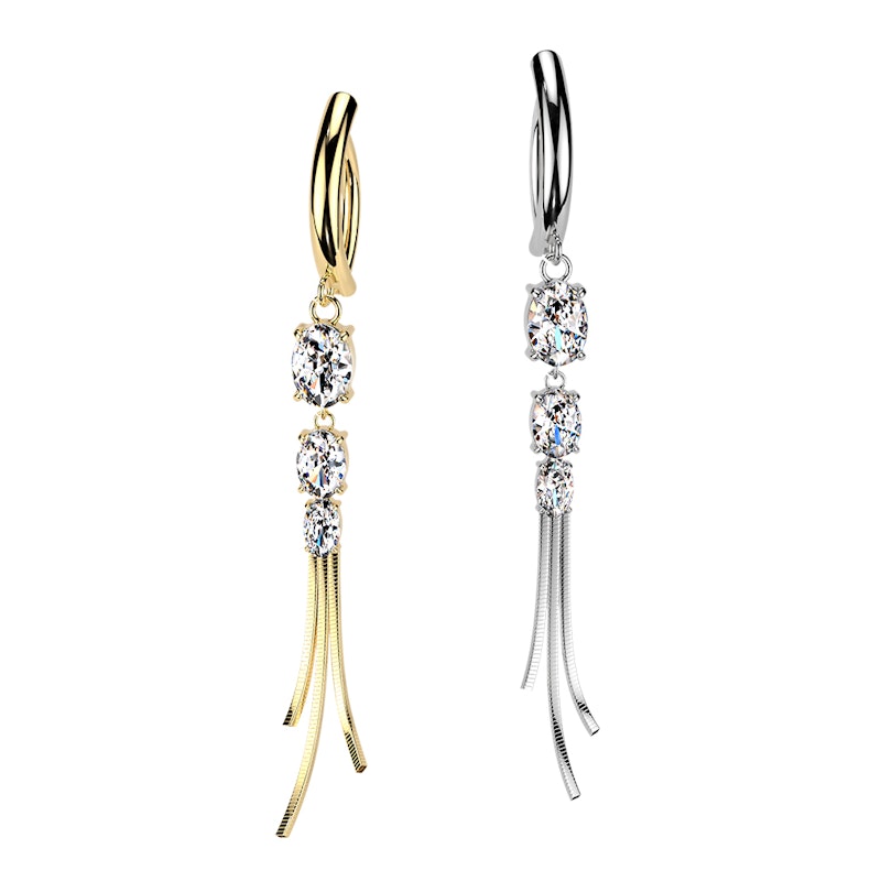 Tu veux ajouter un détail qui fait toute la différence à ton piercing au nombril ? Ce clicker pour le nombril avec des pierres et des chaînes est exactement ce dont tu as besoin ! Comme tu peux le voir, il possède de sublimes pierres avec un sertissage à griffes et de fines chaînes qui pendent, pour toujours plus de mouvement et de caractère. Deux modèles sont disponibles : un doré et un argenté.