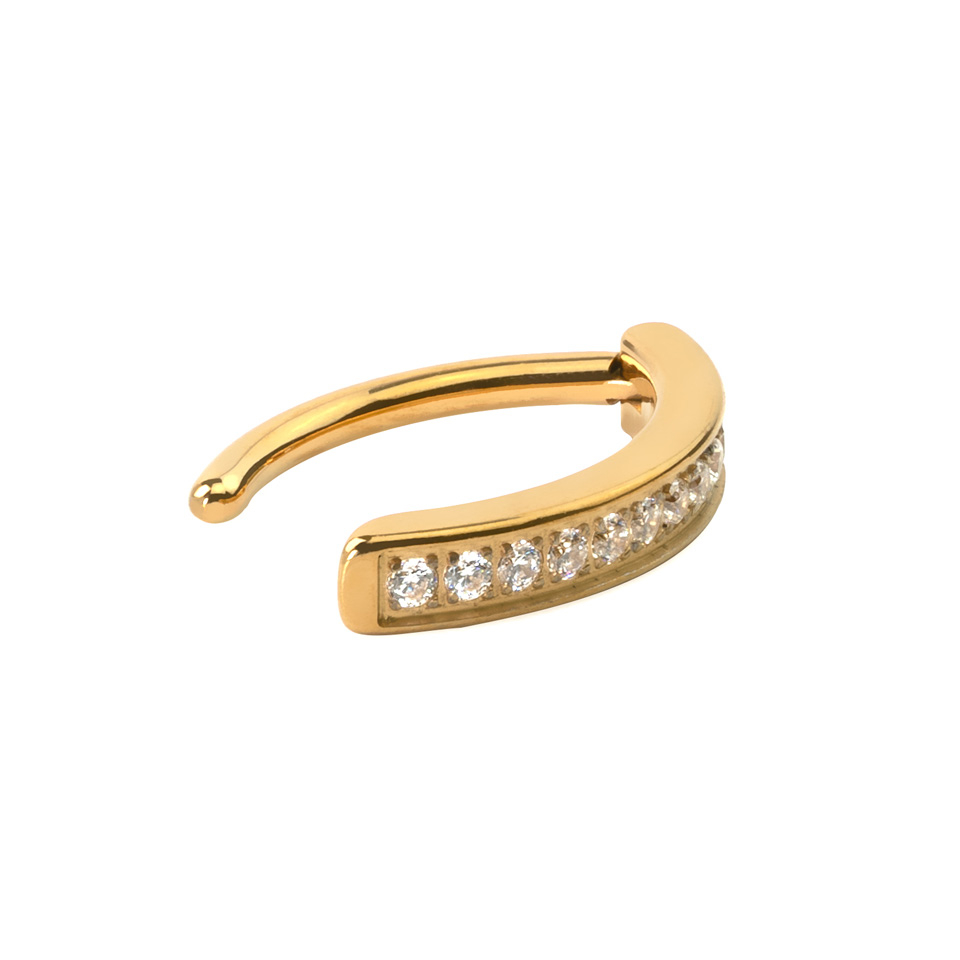 Le joli bijou que nous te présentons est un clicker pour le nombril. Comme tu peux le voir, il est doté d'une sublime rangée de pierres scintillantes, idéal pour ajouter une touche glamour à ton style. Il est également très agréable à porter en raison de sa courbure plus prononcée qu'un anneau classique. Autrement dit, il est beaucoup plus près de ton corps une fois en place. De plus, ce bijou est en titane, un matériau hypoallergénique, léger et durable.