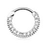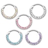 Il est décoré avec une chaîne de diamants qui vont au fond du bijou, et sont également disponibles en cinq couleurs différentes. Les brillants atteignent l'extrémité supérieure du bijou, presque jusqu'à la tige, de sorte qu'une seule fois placé, tu peux voir ces couleurs vives et leur jeu dès que la lumière les frappe. Quelle que soit la couleur choisie, tous les bijoux ont une rangée de billes de part et d’autre, à l’extérieur et à l’intérieur du cerceau. Cette conception est à la fois élégante et soignée dans les moindres détails.