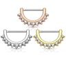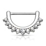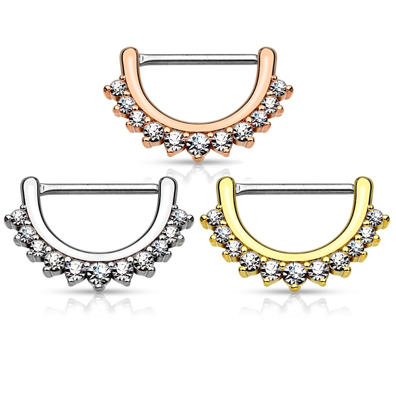 Les diamants sont placés en rangée, le long de l'arc du bijou, de sorte qu'une fois placés, ils restent sous la tétine en forme de demi-lune. C'est-à-dire de la charnière du bijou à la fermeture par clic du bijou.