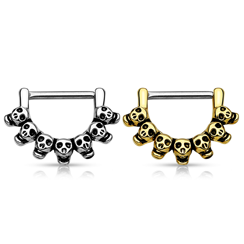 Le design de ce bijou nous rappelle le jour des morts au Mexique, qui est un événement magnifique. En fait, le bijou a plusieurs crânes souriants placés les uns après les autres symétriquement, qui sont sous le mamelon. Choisis ce magnifique bijou en argent ou en or, les deux avec un contraste sombre.
