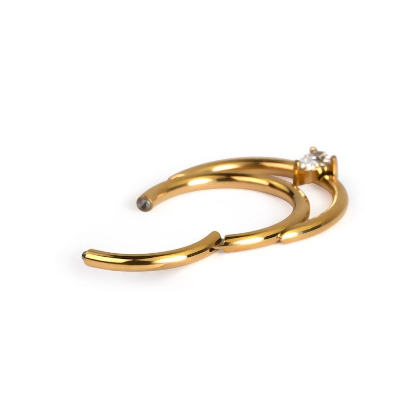 Le bijou que nous te présentons est un double anneau en titane à charnière avec une pierre en forme de goutte. L'élégance de ce sublime bijou provient de sa pierre en forme de goutte qui relie les deux anneaux pour créer un bijou emblématique. Ce bijou est disponible en deux couleurs différentes, à savoir : or et argent. Il possède une épaisseur du fil de 1,2 mm et est également disponible en deux diamètres différents (8 mm et 10 mm). Il s'agit d'un bijou idéal pour les trous de piercing à l'hélix, au daith ou au septum.