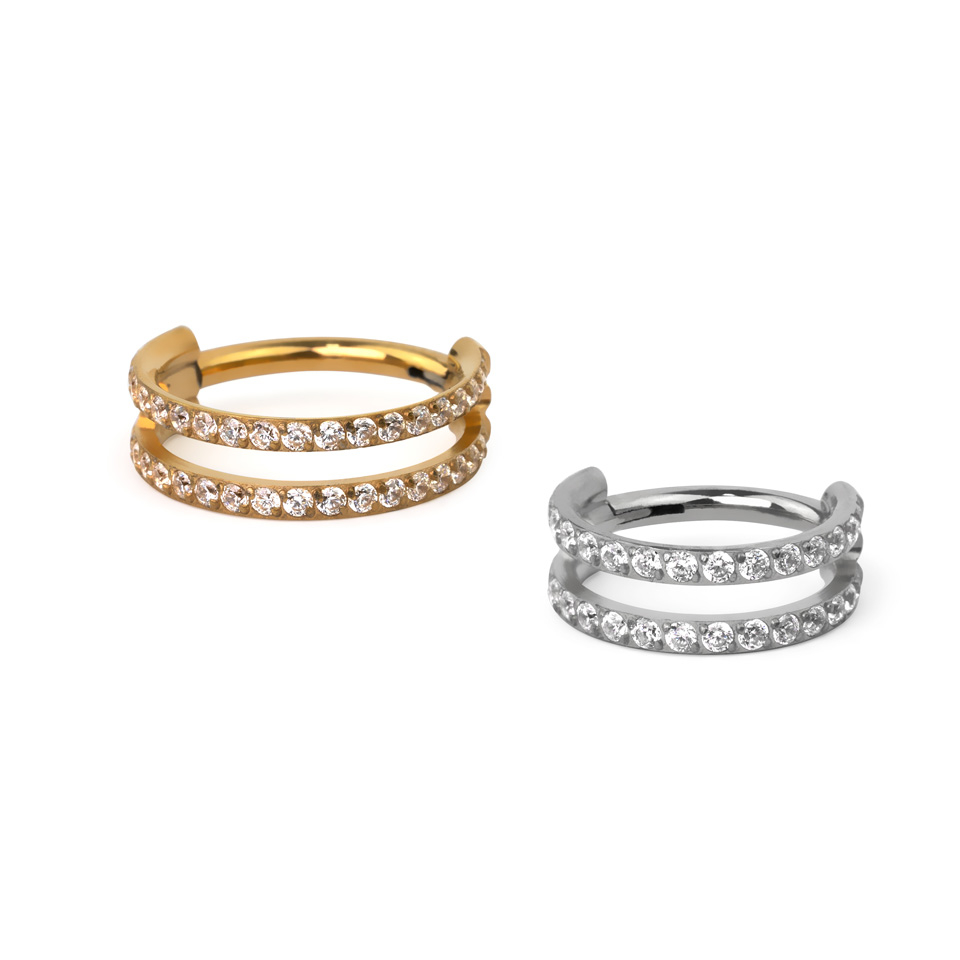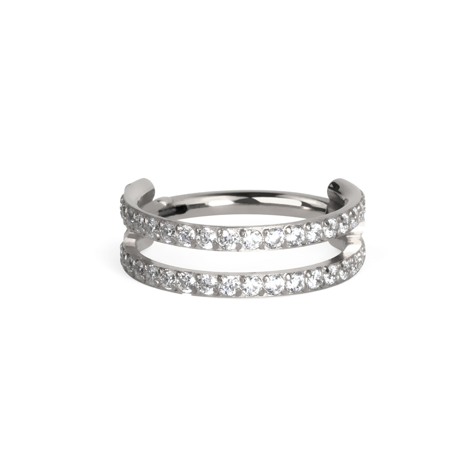 Ce magnifique double anneau présente deux demi-cercles ornés de pierres transparentes en zircon. Si tu aimes les bijoux brillants avec une touche bling-bling, cet anneau va doublement te plaire !