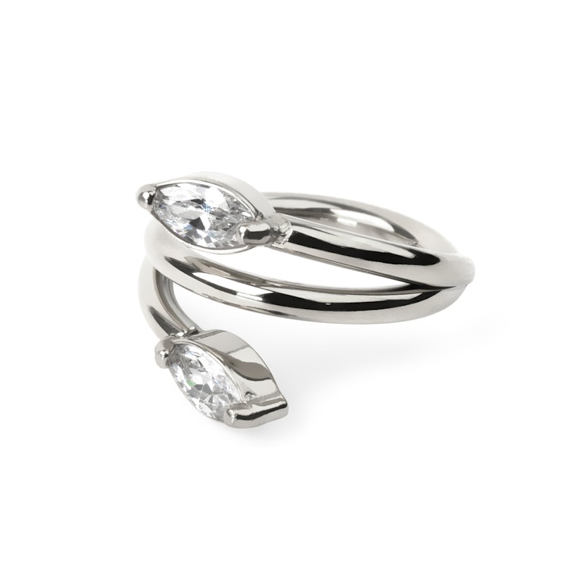 Le bijou que nous te présentons est un joli anneau segment en acier chirurgical, orné de deux sublimes pierres taillées en marquise qui font penser à des feuilles de vigne. Cet anneau au design saisissant est disponible en deux diamètres différents, 8 mm et 10 mm, et en deux couleurs différentes, or et argent. Cet anneau polyvalent sera plus du plus bel effet dans les trous de piercing à l'oreille, et plus particulièrement dans ceux au cartilage, tels qu'au rook ou à l'hélix.
