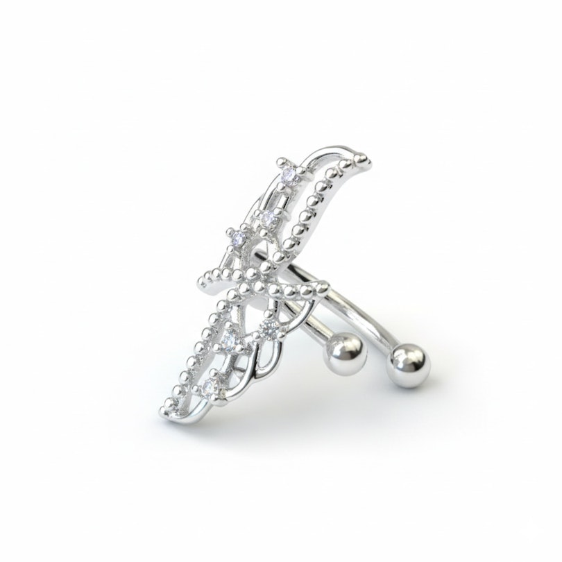 Le sublime bijou que nous te présentons est un faux piercing. Il s'agit plus précisément d'un earcuff avec un design saisissant en forme d'ailes orné de pierres et de perles. Ses deux extrémités sont de forme arrondie, pour un confort optimal. Et ce n'est pas tout ! Il est fabriqué en acier chirurgical, un matériau durable, qui ne rouille pas au contact de l'humidité et qui ne colore pas la peau.