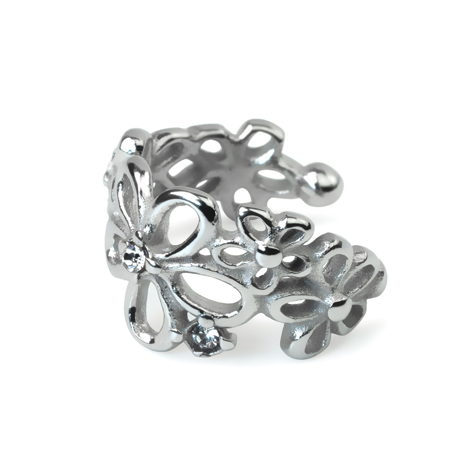 Le joli bijou que nous te présentons est un faux piercing. Il s'agit plus précisément d'un earcuff qui affiche un design floral. Comme tu peux le voir, chaque fleur a une taille différente, ce qui crée un effet saisissant une fois ce bijou en place au niveau de ton oreille. Au centre des plus grandes fleurs se trouve une jolie pierre scintillante, idéal pour ajouter de l'éclat à ton look. Les extrémités de ce faux piercing sont de forme arrondie, pour un confort maximal.
