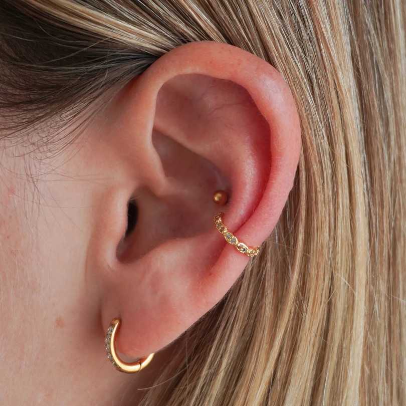 Ce bijou est fabriqué en laiton plaqué or. Il convient à la plupart des types de peau et est conçu pour être porté au quotidien. Résistant aux éclaboussures, durable et facile à utiliser, cet earcuff est le moyen idéal pour sublimer ton look, sans t'engager de manière définitive avec un vrai piercing.