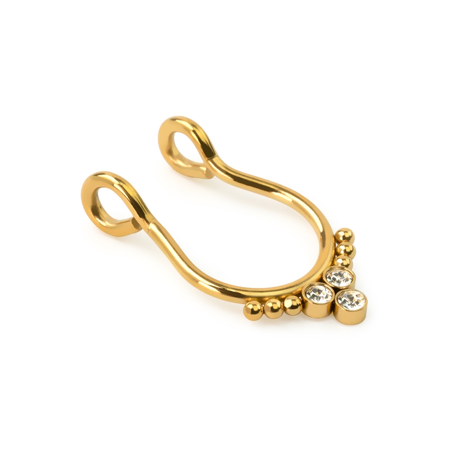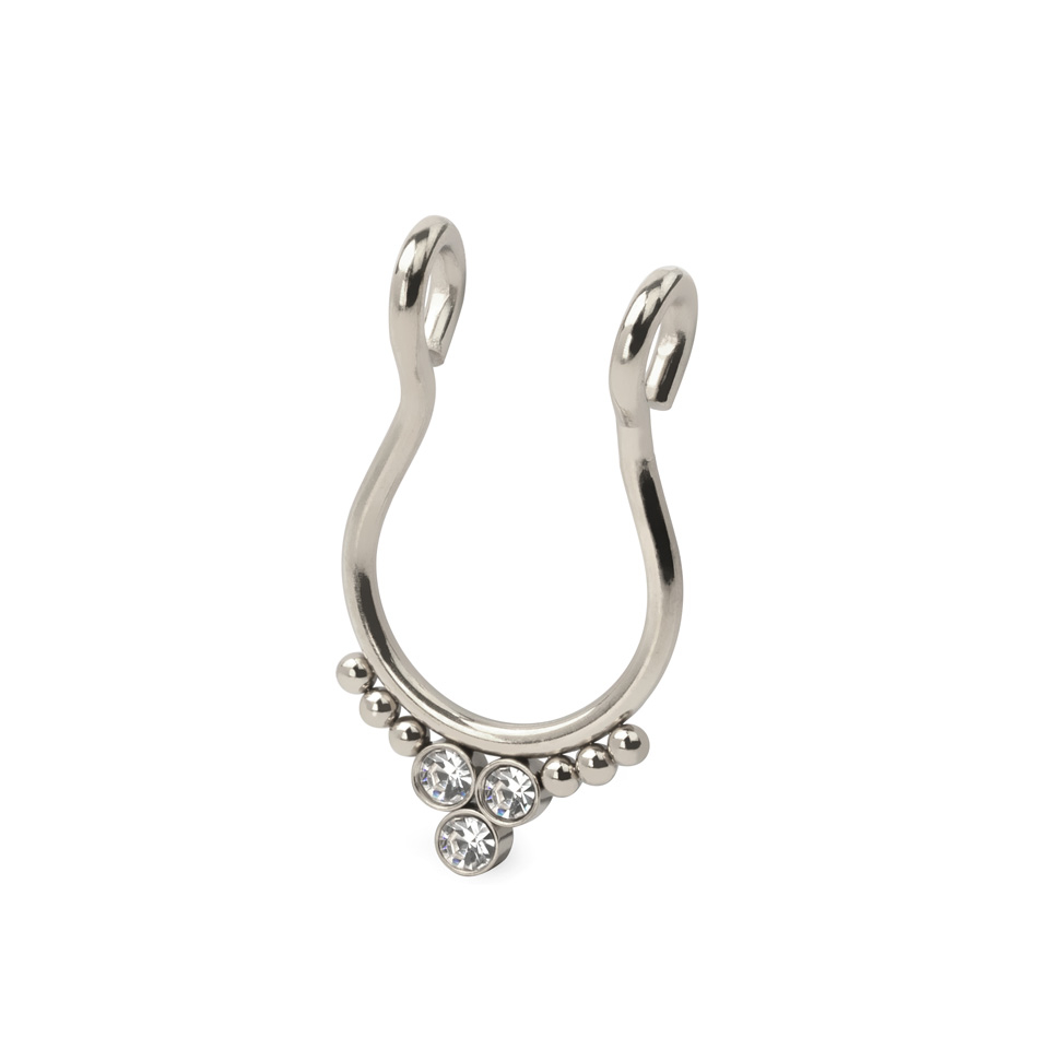 Nom: Faux anneau pour le septum avec trois pierres et des perles à chaque extrémité