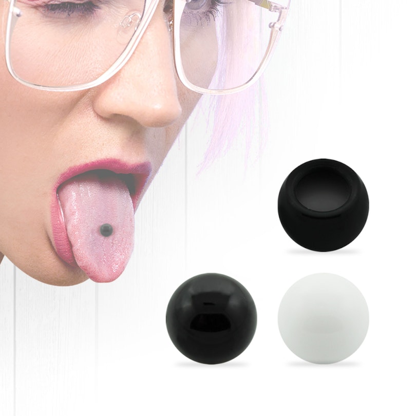 Voici un faux piercing à la langue qui ne nécessite pas de trou dans la langue pour l'utiliser. Avec celui-ci, tu peux à la fois sentir et voir comment ca fait d’avoir un piercing de la langue avant de commencer à te faire percer. Ce faux piercing à la langue est disponible en deux couleurs, noir ou blanc. La balle est en acrylique, où une cavité est faite sur un côté. Ce trou aide à créer un vide qui permet à la boule de coller à la langue lorsque tu aspires de l’air et crée ainsi une pression négative.
