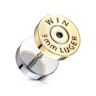 Le bijou que nous te présentons est un faux plug doté d'un motif représentant l'arrière d'une balle de pistolet. Il s'agit d'un faux plug, car tu peux le porter dans un trou de piercing standard (1,2 mm). En raison de son diamètre de 10 mm, personne ne verra la différence entre ce bijou et un plug classique. De plus, le texte gravé dessus ajoute une touche originale et réaliste.
