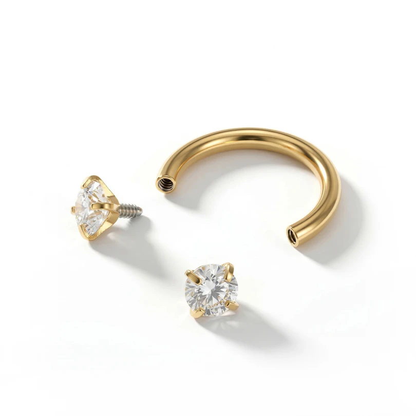 Les pierres sont vissées dans la tige, plutôt que sur la tige. Cela signifie que le fer à cheval a un filetage interne. Le fil est ainsi caché et le risque de déchirure à l'intérieur de ton piercing est considérablement réduit.
