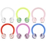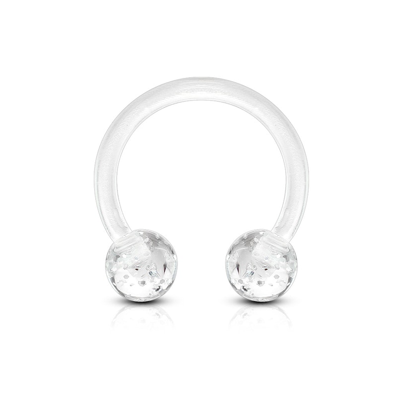 Pour ce fer à cheval en acrylique, les boules ont été incorporées dans un motif de paillettes. Le fer à cheval est disponible en plusieurs couleurs, y compris le bleu, le vert et le rose. La couleur des fers à cheval n'est pas 100% identique à la couleur des boules. Par exemple, le fer à cheval bleu est un peu plus clair que la couleur des boules correspondantes. Le cheval est flexible, ce qui peut être utile pour l'insertion car le fer à cheval peut légèrement se plier lorsqu'il pénètre dans le trou de piercing.
