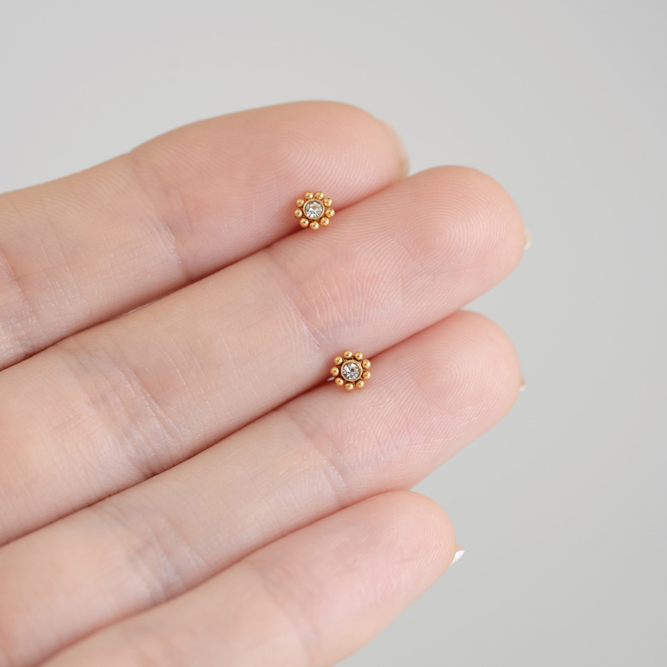 De la même manière, chaque modèle est doté d'une pierre transparente sur la partie supérieure ainsi que d'un filetage interne. Ceci est très appréciable, car un filetage interne n'éraflera ou n'endommagera pas l'intérieur de ton trou de piercing au moment de son insertion, à la différence d'un filetage externe.